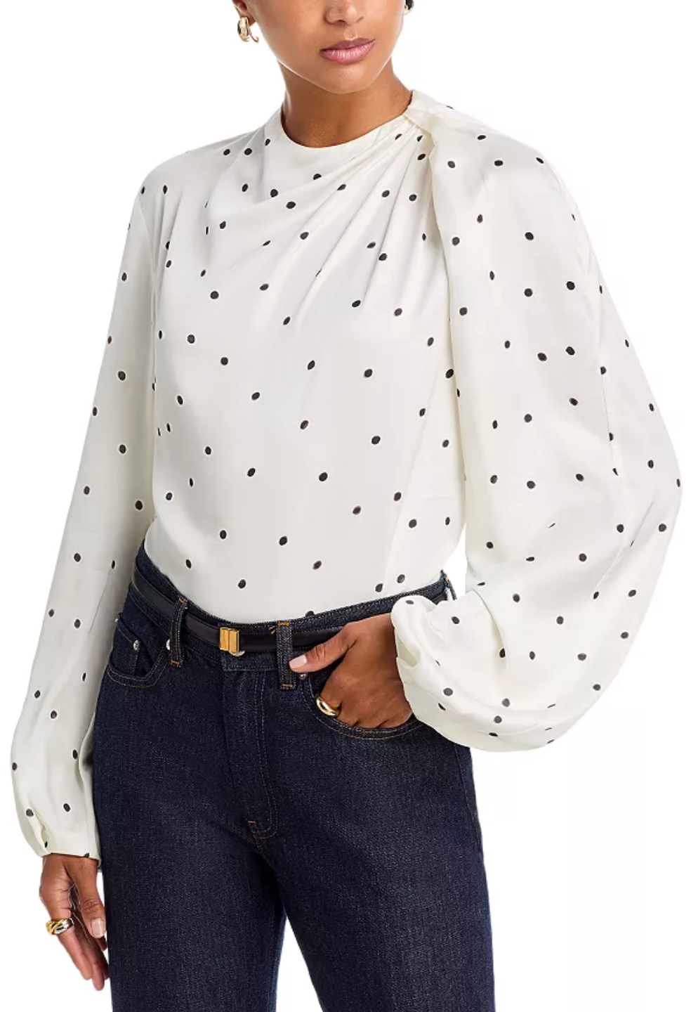 - Allover dot print, gathered details at neck