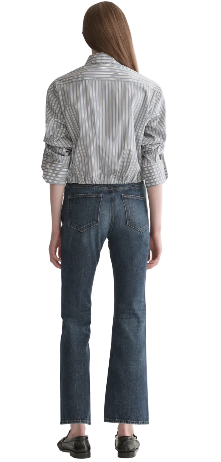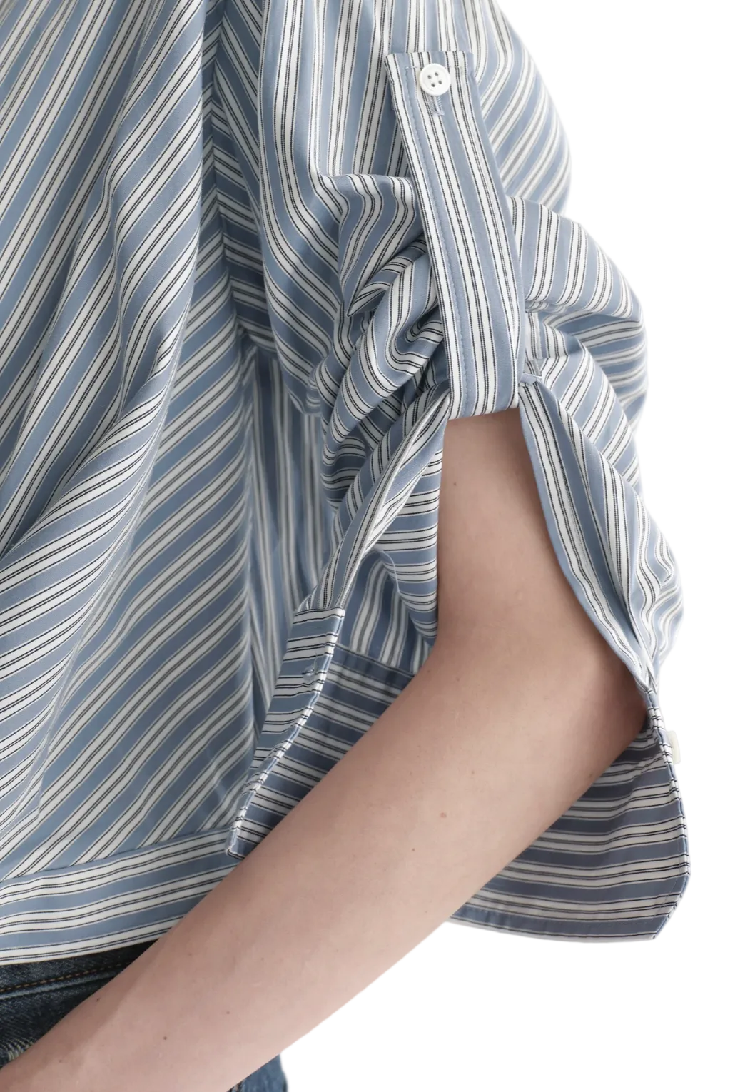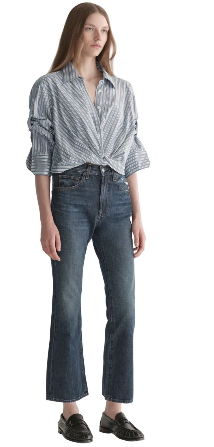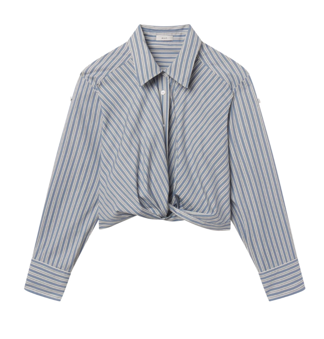 The Leo Top is crafted from crisp 100% cotton in a vertical shirting stripe of white and steel blue. This cropped button-down silhouette features a sharp collar, convertible long sleeves, and a twisted hem detail that hits at the navel for a relaxed, modern shape.