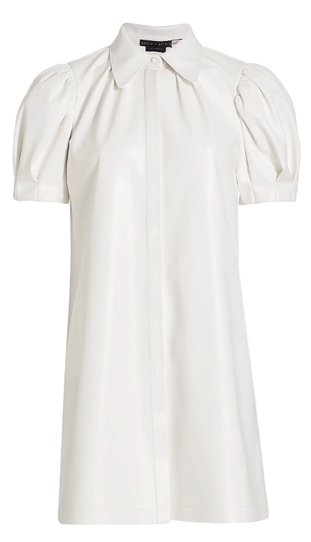Evoking an edgy aesthetic, this Alice + Olivia Jem shirtdress showcases a shift silhouetted crafted of shiny faux leather. This look features a tailored point collar and short puffed sleeves, finished with a clean concealed closure.