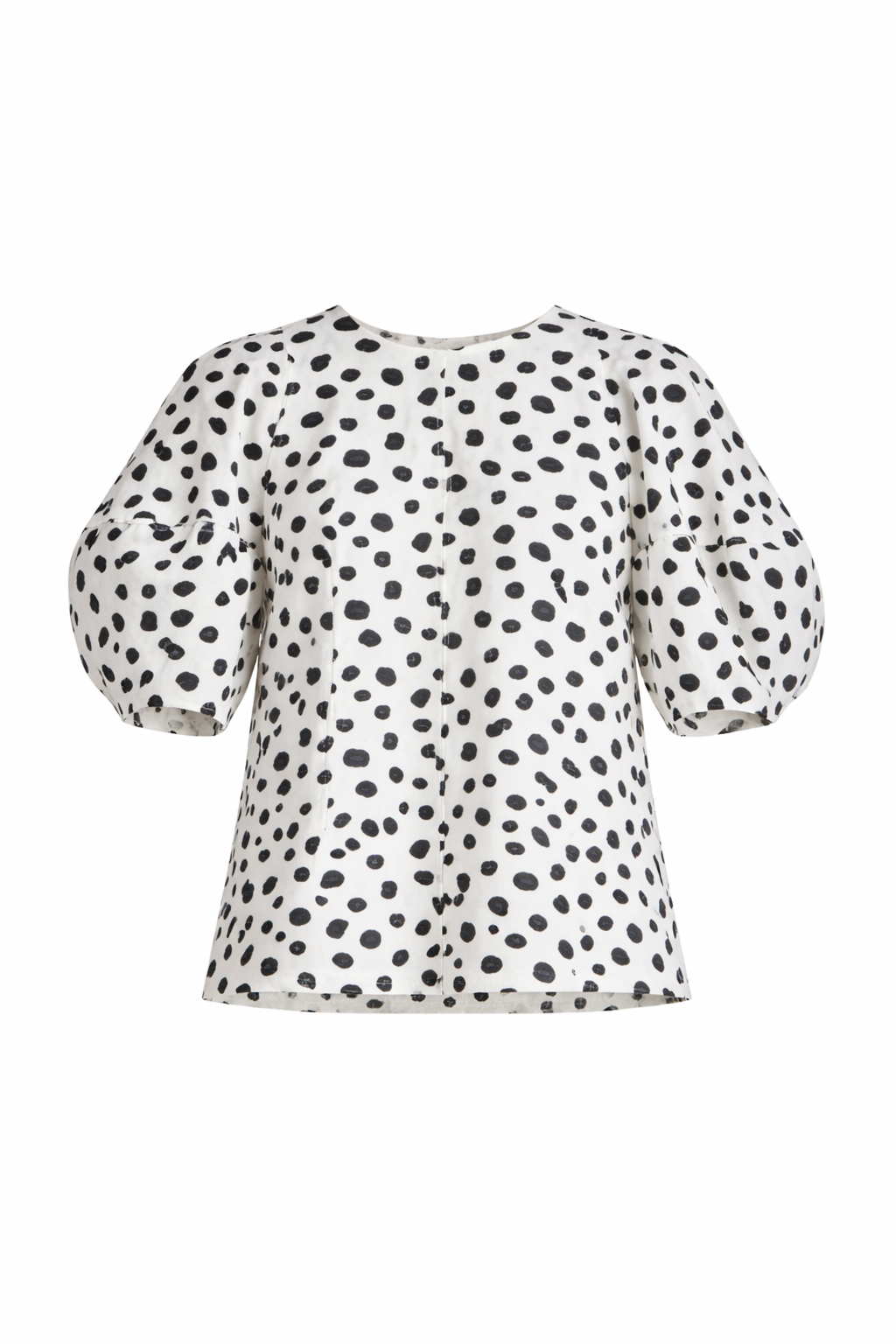 An easy silhouette complete with a flattering high neck and feminine puff sleeves.