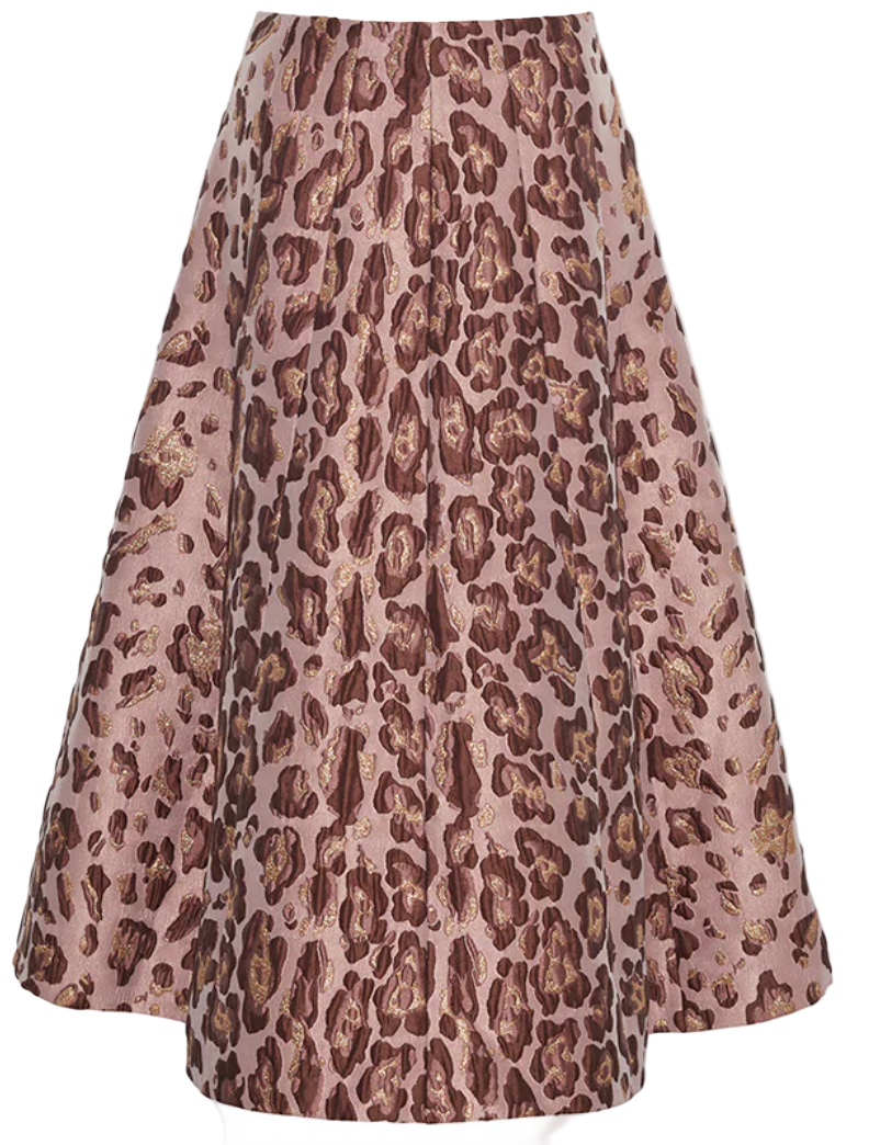Cara Cara was established by a trio of friends "as an expression of vibrancy and joy." Capturing that spirit, this 'Mimosa' skirt is made from panels of brocade woven with leopard spots and flecked with metallic threads. It flares out to a full, midi hem.
