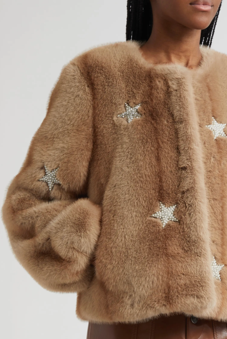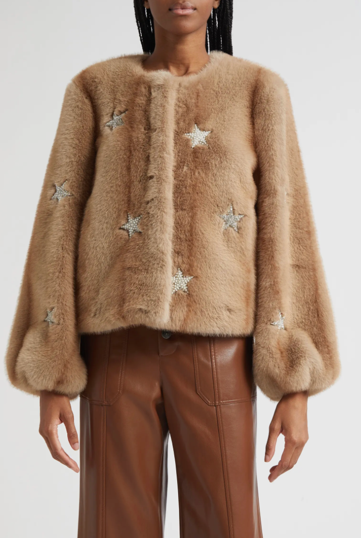 Crafted of soft faux mink, the Benson coat from Cinq à Sept is detailed with pearl star embellishments.