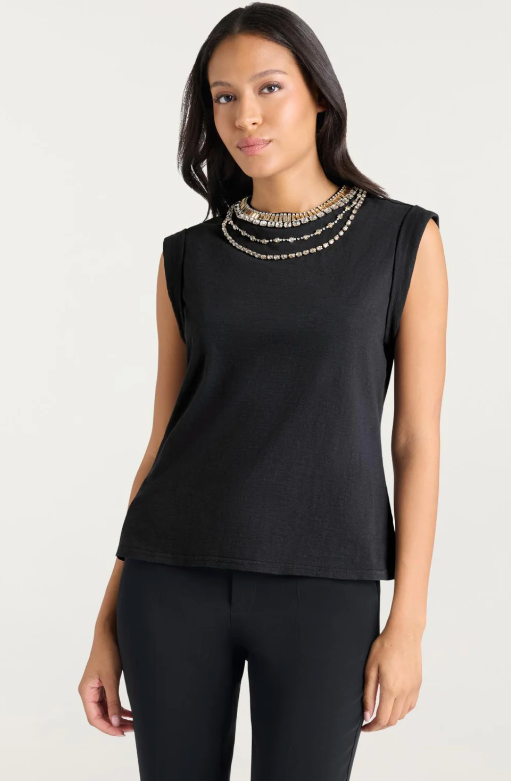 Step up your fashion game with the Layered Necklace Bella Tee. The perfect combination of comfort and style, this sleeveless tee features a stunning embellished necklace detail that will elevate any outfit. Stand out from the crowd and make a statement with this must-have addition to your wardrobe.