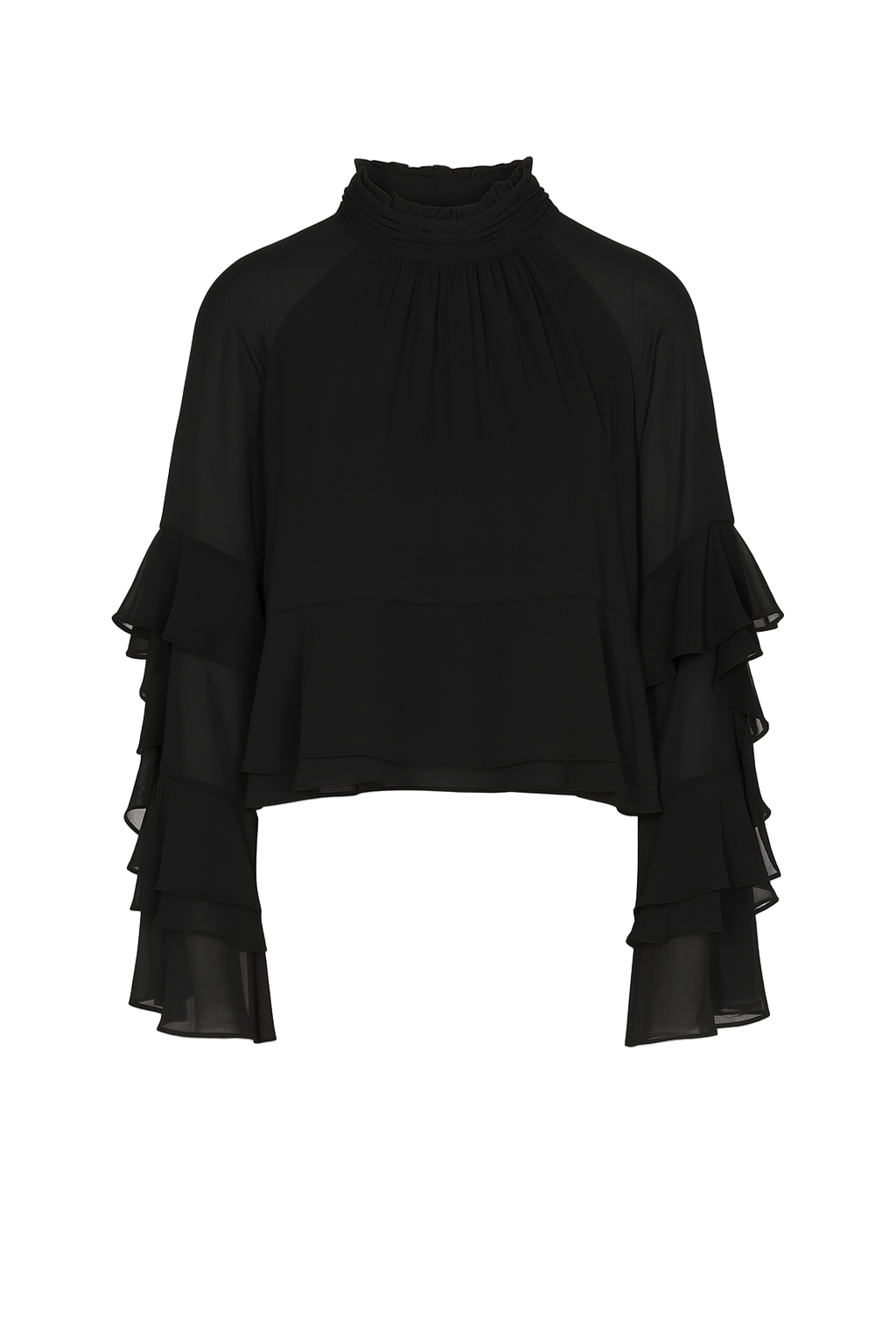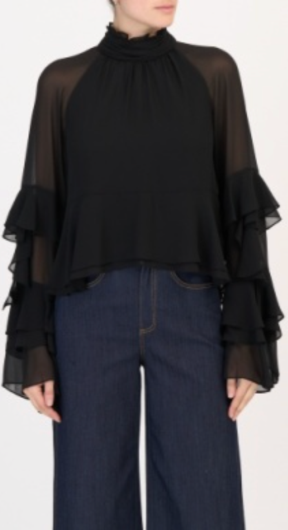 Draped in a dreamy trapeze shape, the Skylah Top floats effortlessly around the body, echoing the romance of a fairytale with cascading ruffles framing its layered bell sleeves. Designed in a light, airy polyester, the gathered neckline and stand collar add an element of refined elegance, while the subtle back keyhole and button-loop closure enhance its delicate allure.