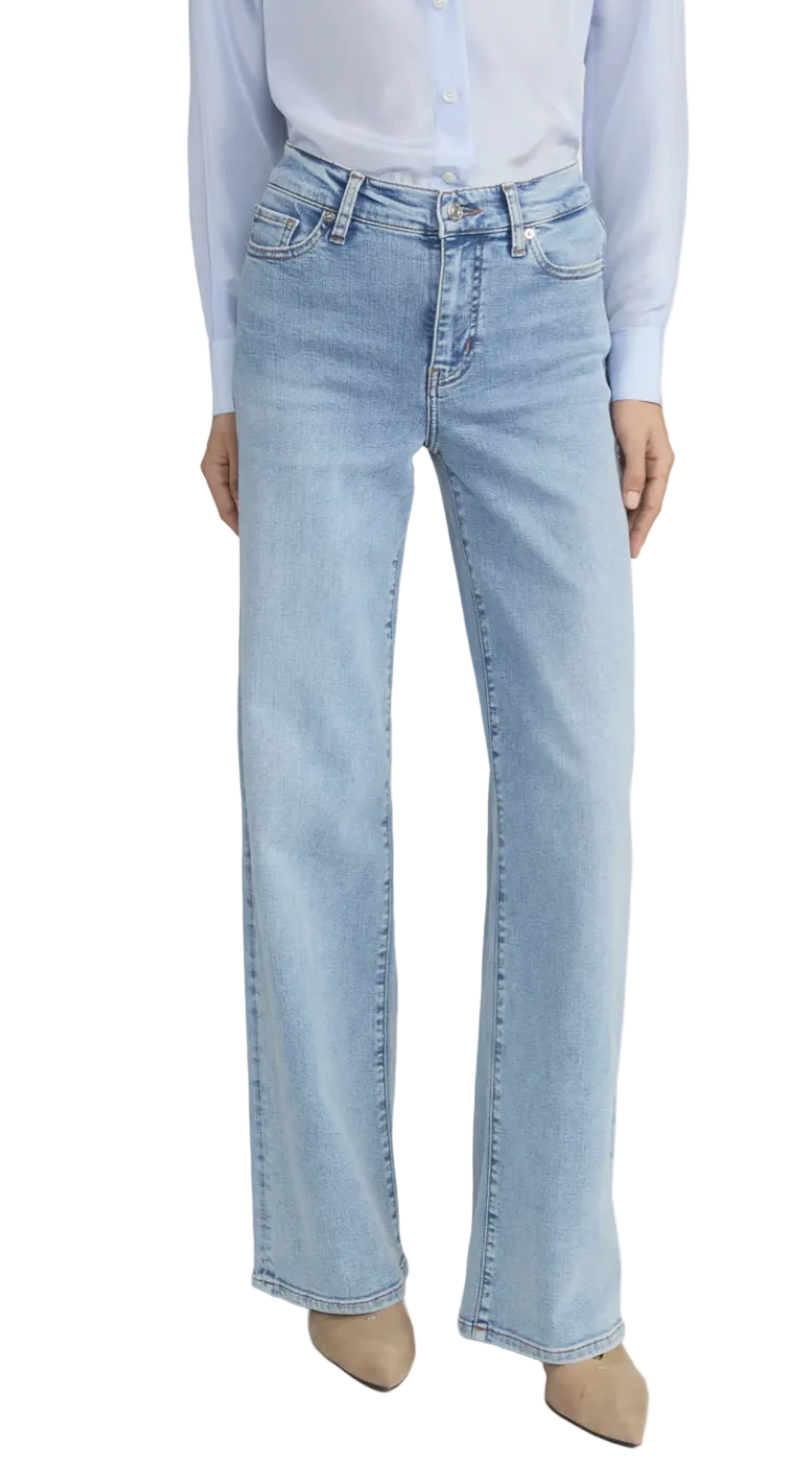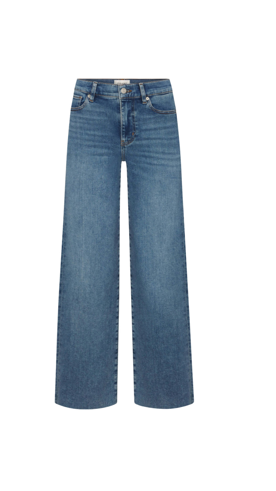 A FRAME introduction to the bestselling palazzo silhouette designed with a comfortable high-rise waist, fitted hip, and subtle wide-leg flare with raw edge. Crafted from an ultra-supple super stretch denim for smooth, all-day wear.