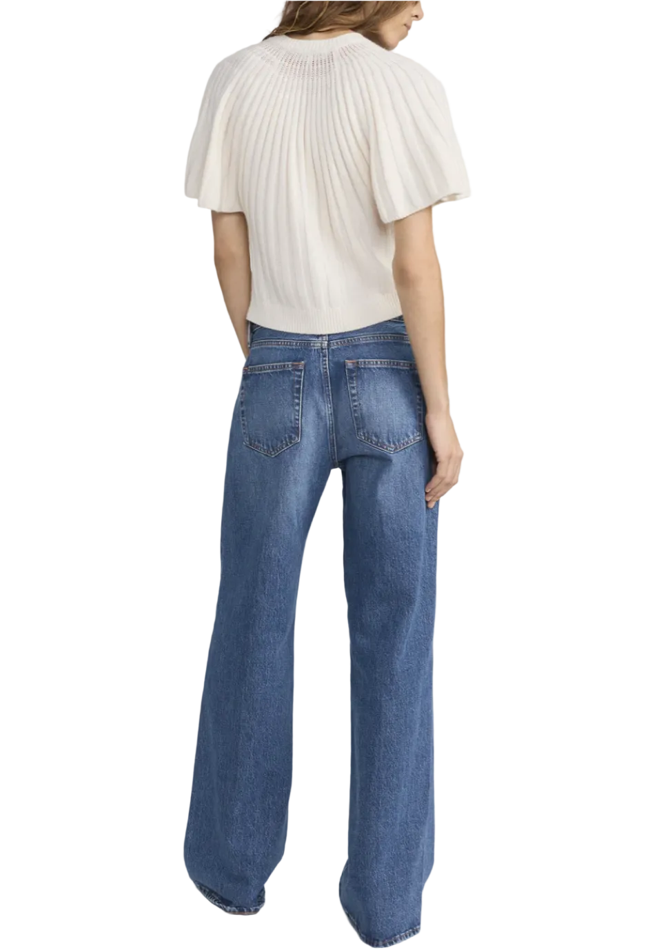 The Flutter Cardigan is crafted from a luxe wool-cashmere blend with a loose rib knit, featuring flutter sleeves and gold knot buttons—designed to be worn as a top or layered as a cardigan.
