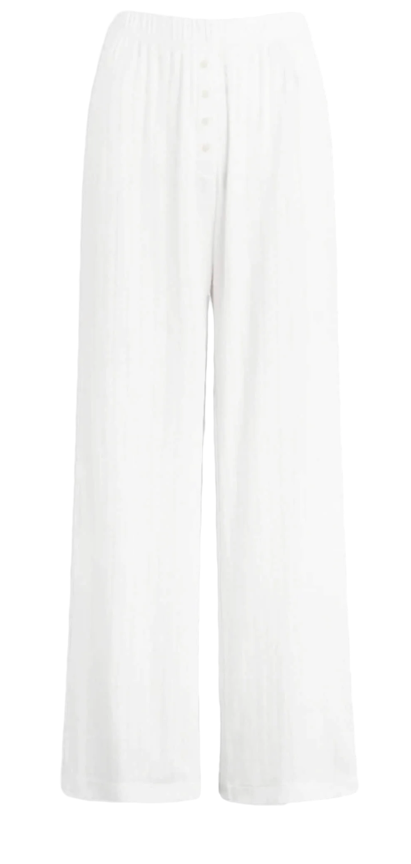 Cut in a nostalgic Pointelle Cotton, The Pointelle Boxer Pant is a wide leg silhouette featuring our signature pinhole stripes, dainty eyelets, tonal henley buttons and a comfortable elasticized waistband that sits at the natural waist.