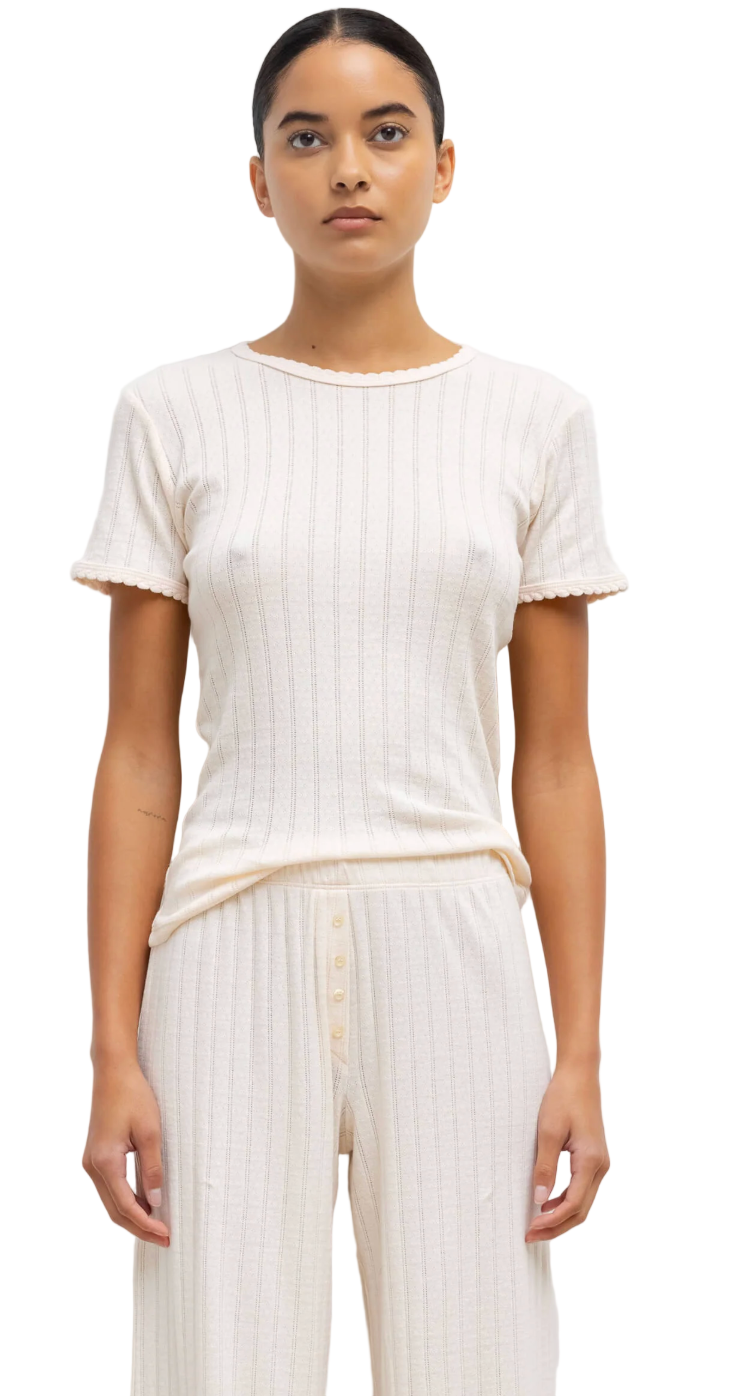 Cut in LESET's nostalgic Pointelle Cotton, The Pointelle Slim Fit Tee features a classic crew neckline with our signature pinhole stripes, dainty eyelets, and scalloped edging.