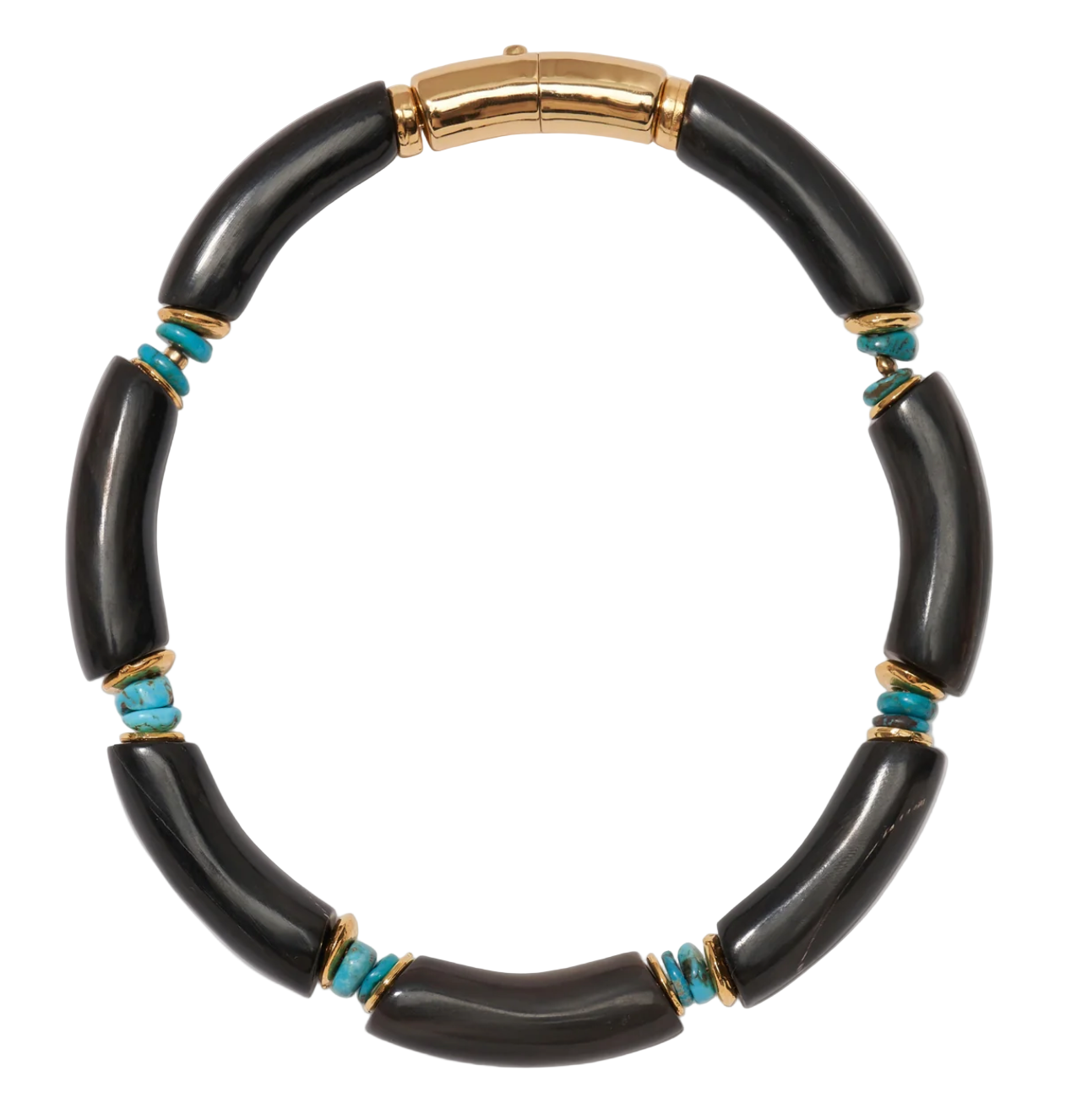 Style? It's practically LF's religion. With black tubular horn beads, dotted turquoise accents, and gold-plated brass macaroni closure.