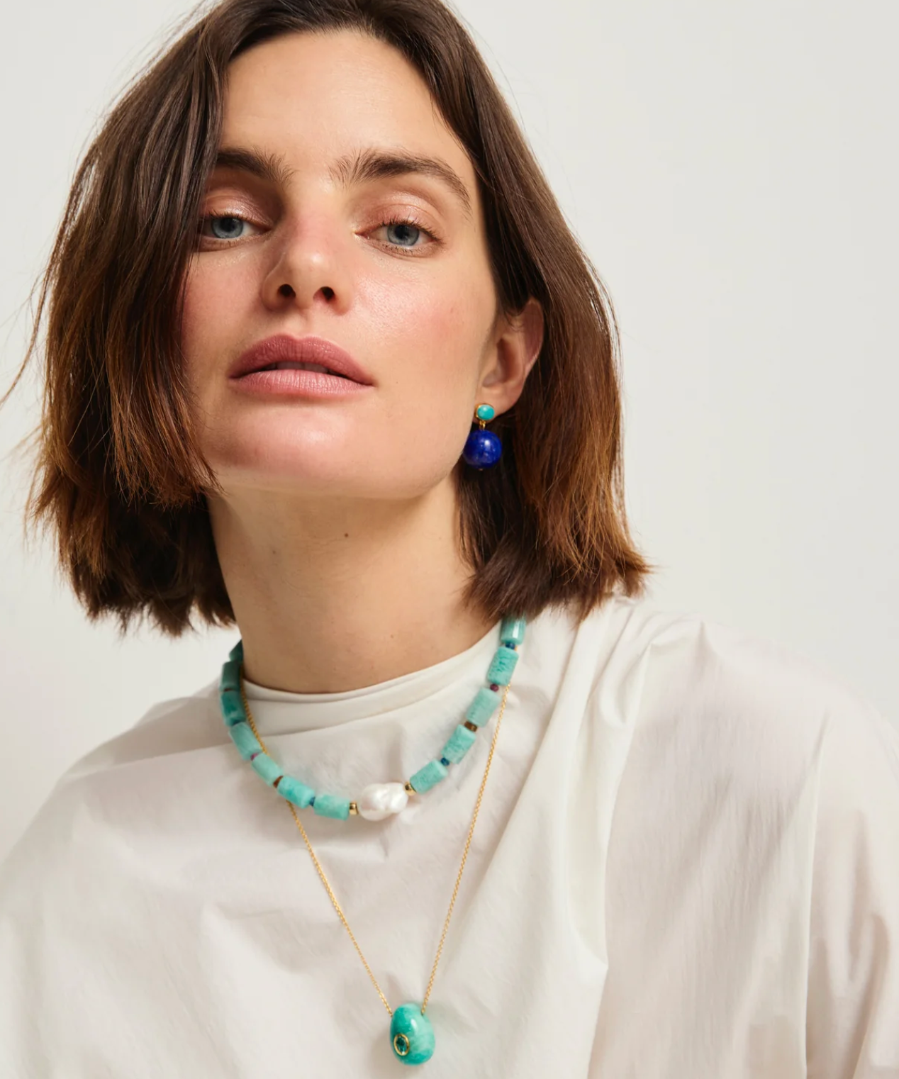 Collect yourself in a single-strand, semiprecious-studded necklace that doubles as an objet d'art. With amazonite tube beads, baroque freshwater pearl focal, and a smattering of faceted garnet, kyanite, and ruby accents.