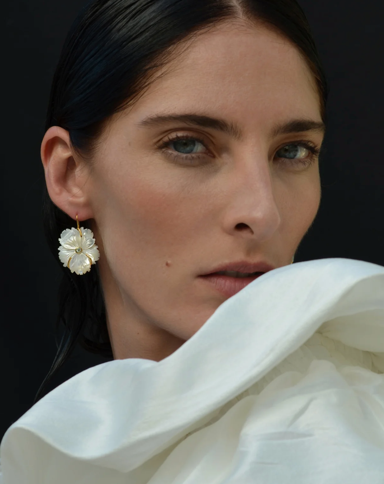 Fulfill your flower-girl fantasies in gold-plated brass earrings that showcase luminous carved mother-of-pearl blooms inlaid with faceted sky blue topaz.