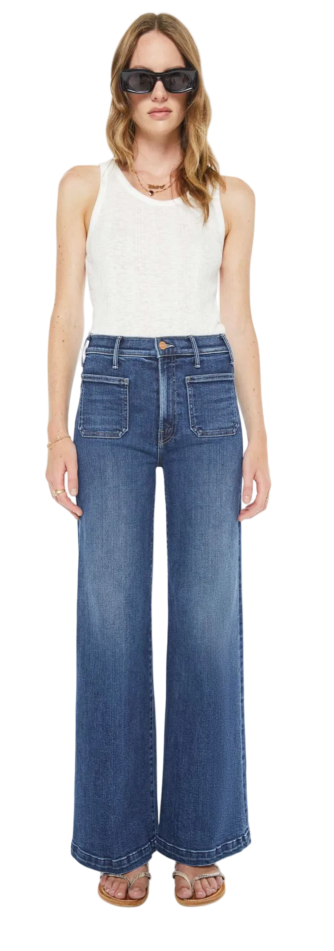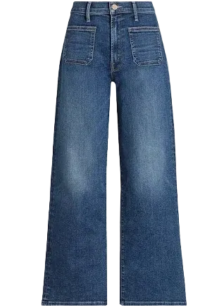Hail Mary. 70s-inspired wide leg jeans with a high rise, zip fly, patch pockets, 31-inch inseam and a clean hem. Made from stretch denim, One Last Shot is a dark blue with subtle whiskering and fading at the knees.