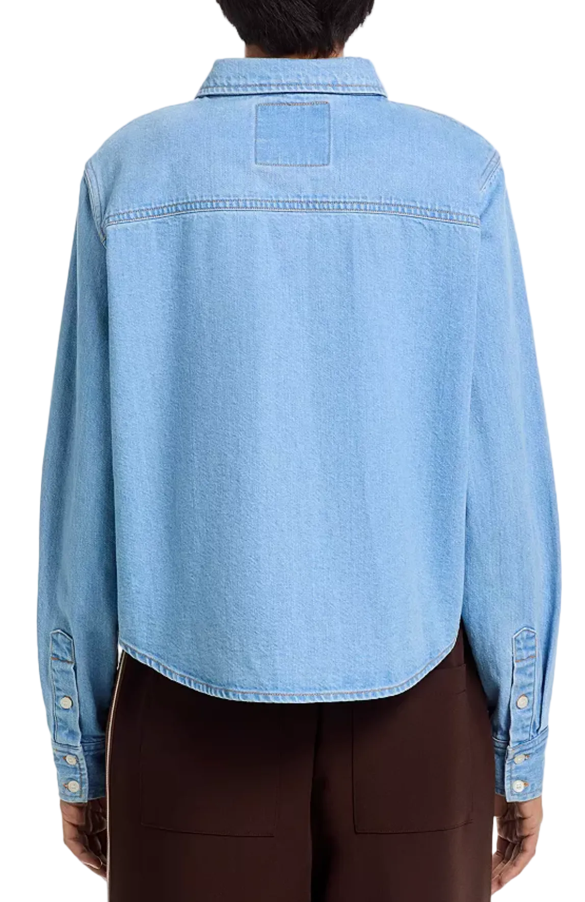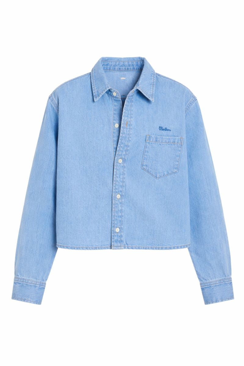 A button-up denim top with a front patch pocket and a curved, cropped hem. Made from semi-rigid SUPERIOR denim.