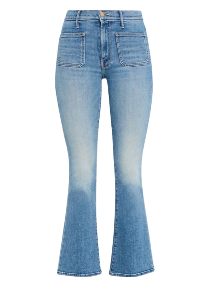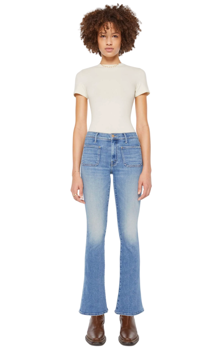 On a roll. This cult-favorite flare has a mid rise, zip fly, patch pockets, a 31-inch inseam and a clean hem. Cut from stretch denim, Poppin' Wheelies is a mid-blue with whiskering and fading at the knees.