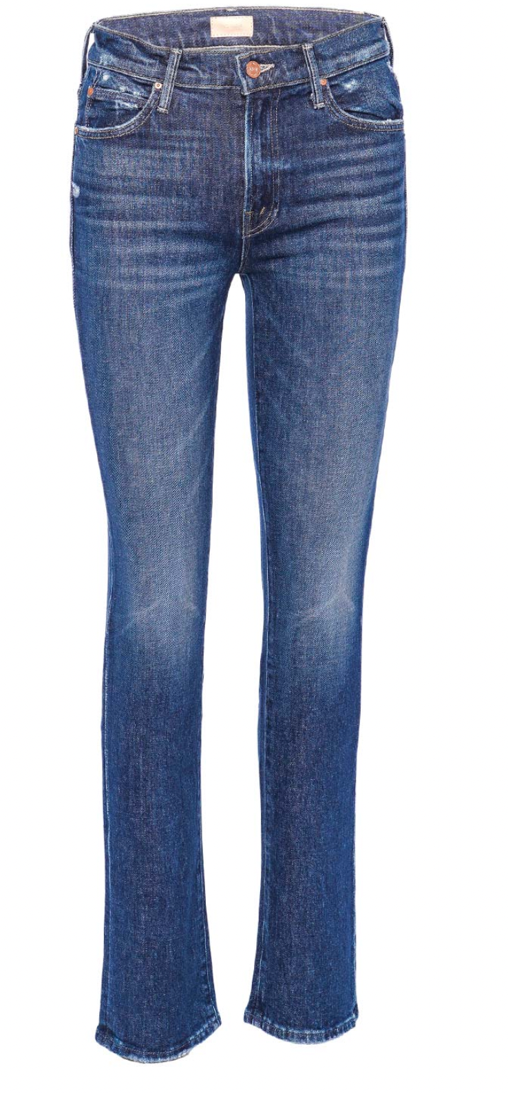 Horsin' around. A mid-rise straight leg with a 31-inch inseam and a clean hem. Cut from stretch denim, Yee Haw is a dark blue wash with whiskering, fading at the knee and distressed details at the pockets.