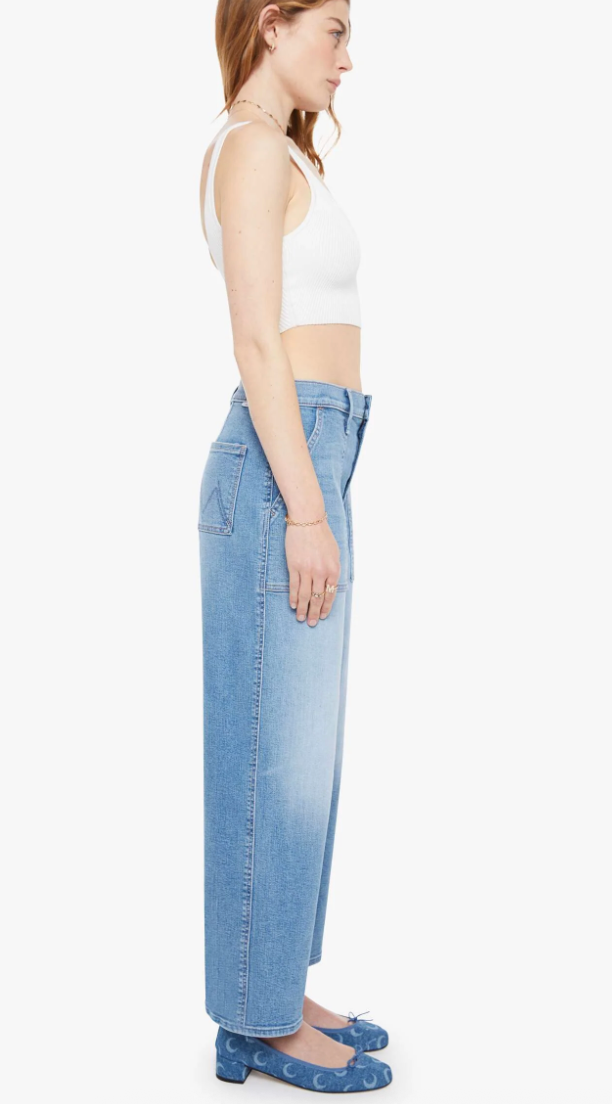 Full throttle. Super high-waisted jeans with a loose fit, wide leg, zip fly, patch pockets and a 28.25-inch inseam with a clean hem. Made from a blend of recycled stretch denim, Ride Hard Live Louder is a light blue with subtle whiskering and fading at the knees.