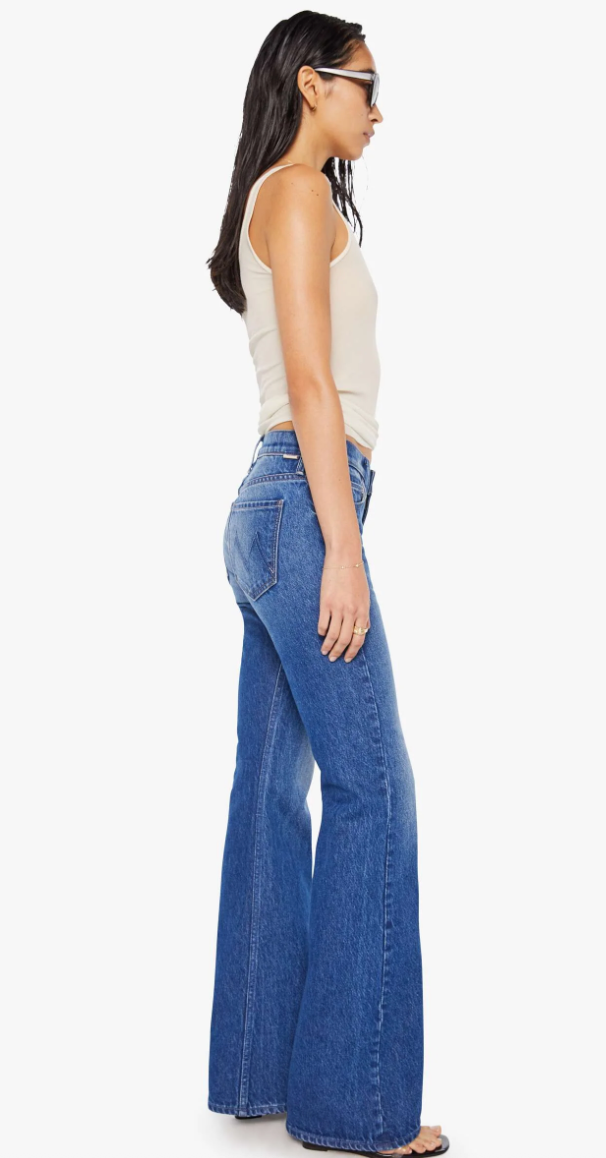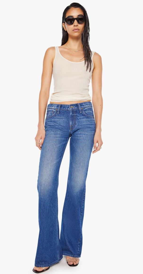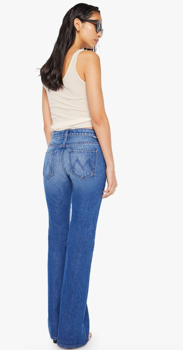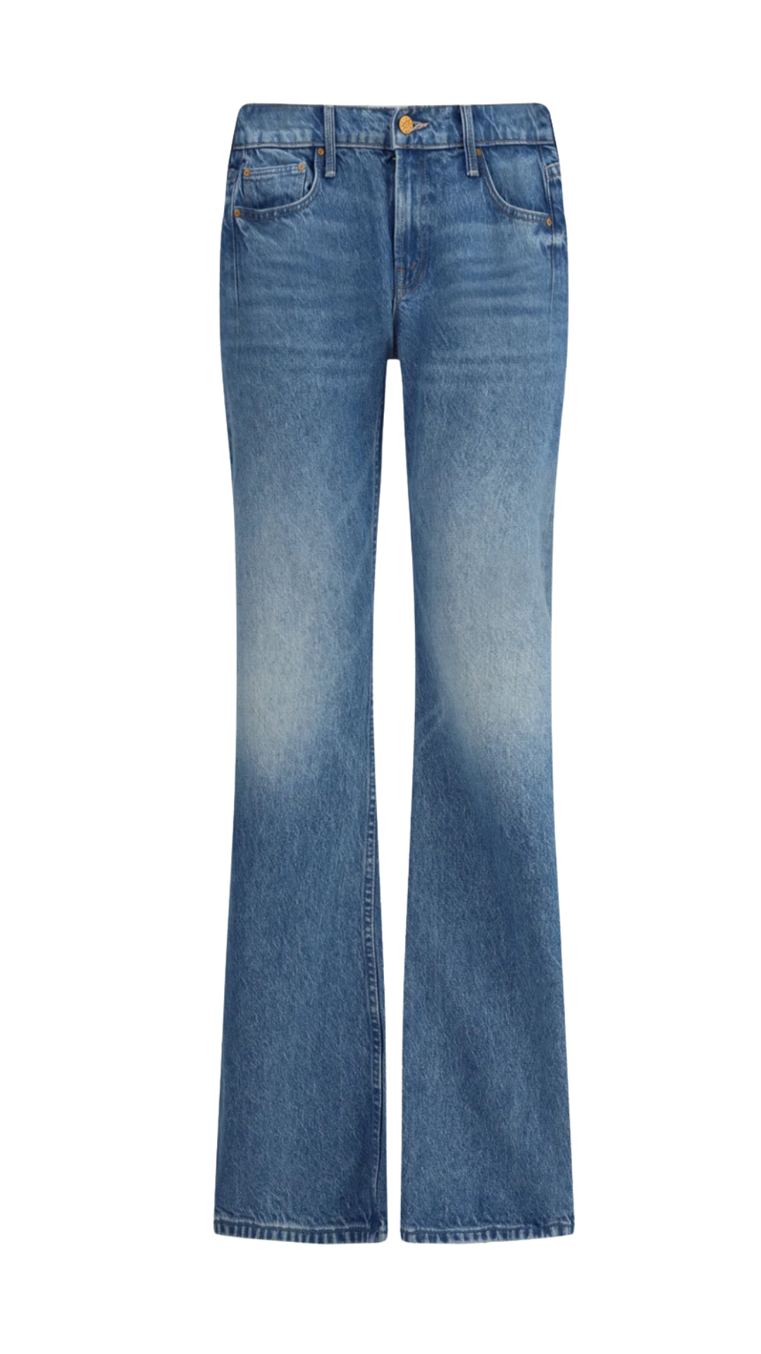A bootcut jean from SNACKS!, a collection of unconstrained silhouettes leaning into exaggerated shapes and extreme proportions. The low-rise jeans feature a slightly flared leg and a long 34-inch inseam with a clean hem. Made from a rigid recycled cotton blend, Scrumptious is a mid-blue with fading, whiskering, a pretzel-detailed button and candy-inspired interior rivets. Would you like a treat?