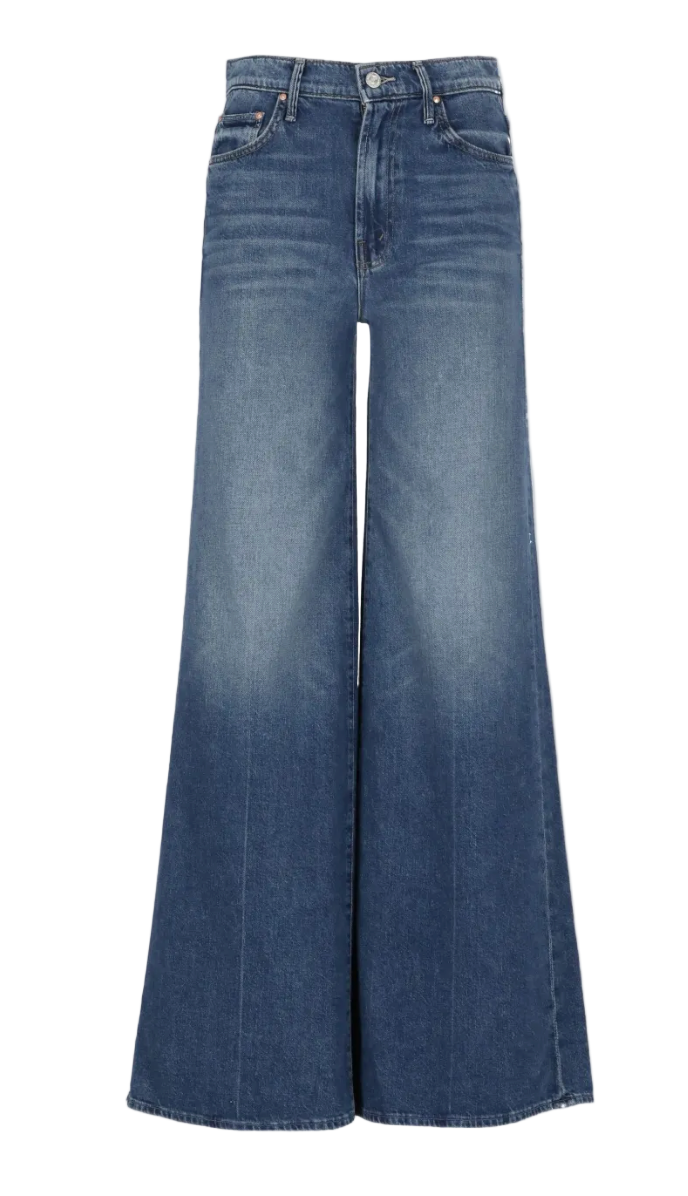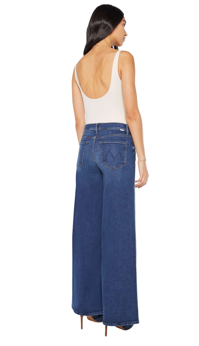 Ready, set, go. Wide leg jeans with a high rise, zip fly and a 33-inch inseam with a clean hem. Made from a blend of recycled stretch denim, Start Your Engines is a dark blue with whiskering and fading at the knees.