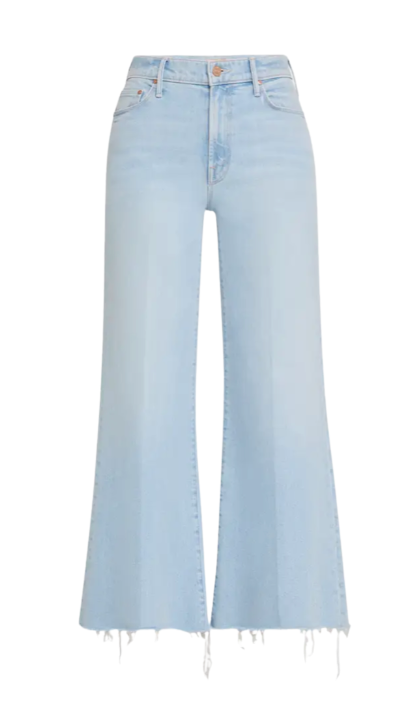 Surf's up. High-rise jeans with a flared wide leg and an ankle-length inseam with a frayed hem. Cut from denim with a touch of stretch, Cowabunga is a light blue with subtle fading throughout.