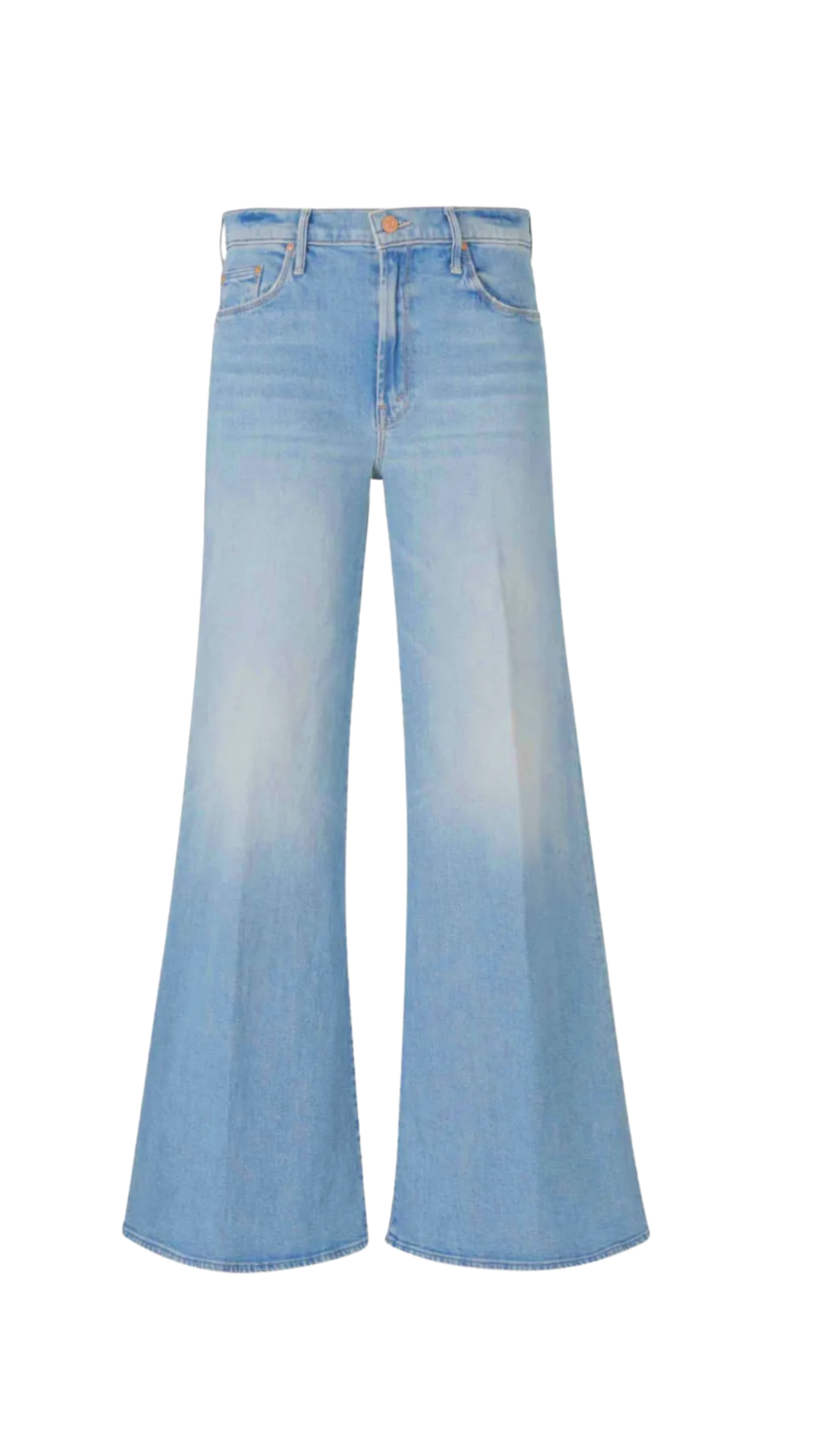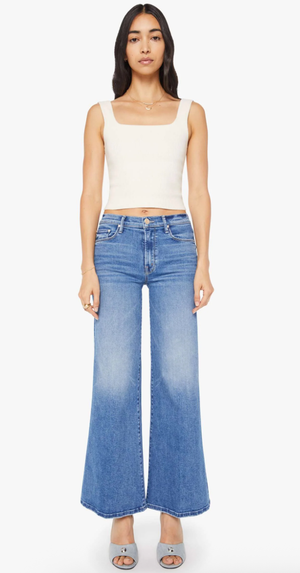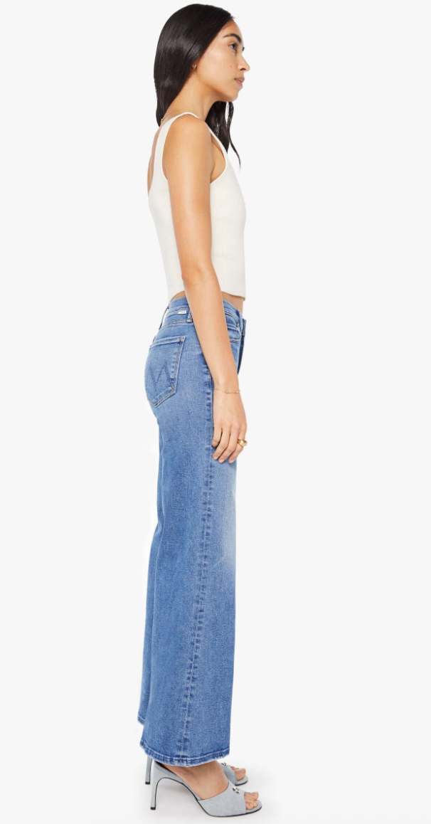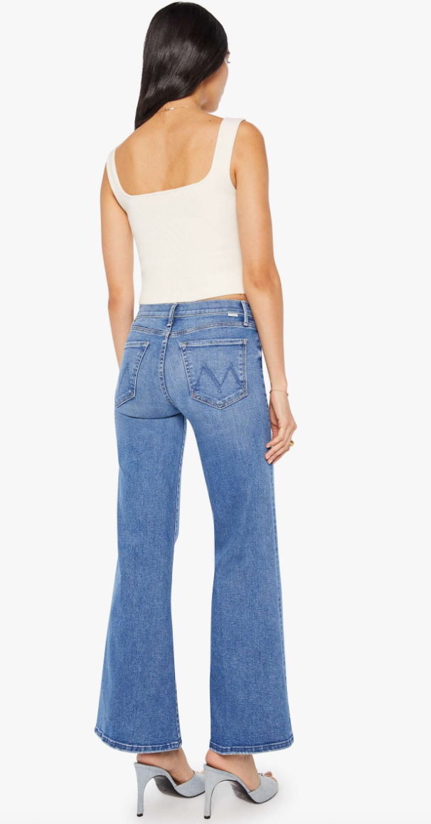 Strike three. High-rise pants with a flared, wide leg and 31-inch inseam with a clean hem. Cut from super stretchy denim, Swing And A Miss is a mid-blue with whiskering and fading at the knee.
