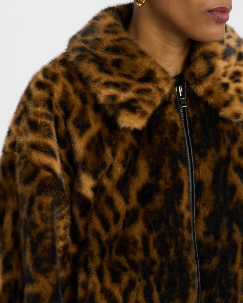 The Esme Jacket is crafted from our sheared faux fur in shades of brown, grey and taupe, giving it a natural look. This cropped silhouette features dropped shoulders and roomy sleeves, with a front zipper and an elasticized waist and cuffs.