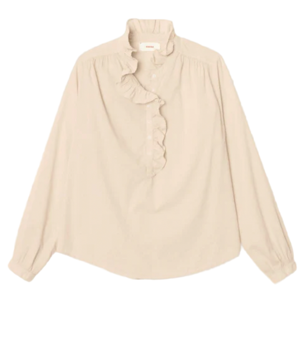 For the Frill of it. Caspian is made in Xirena's classic lightweight woven cotton poplin for a lived-in look and feel. Caspian is a ruffle henley with ruffle details all throughout the neck and front placket. This elevated henley also has shirring at the sleeves, front, and back and a high low hem.