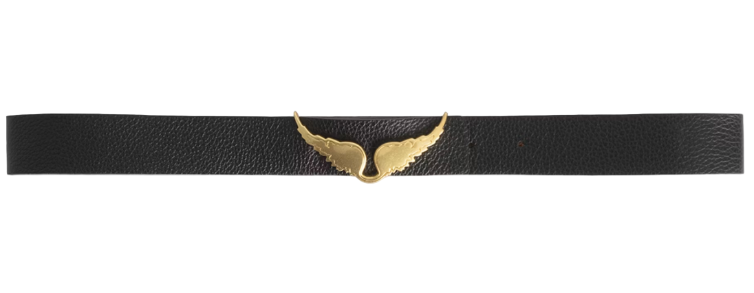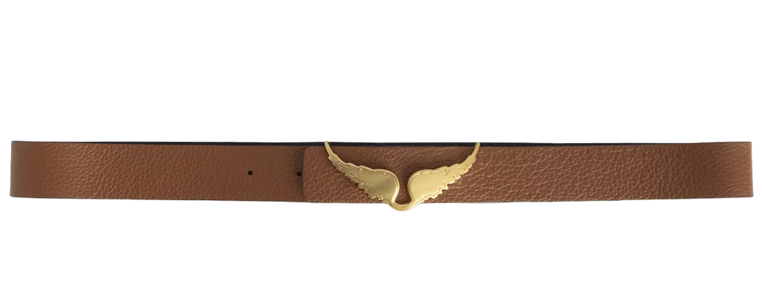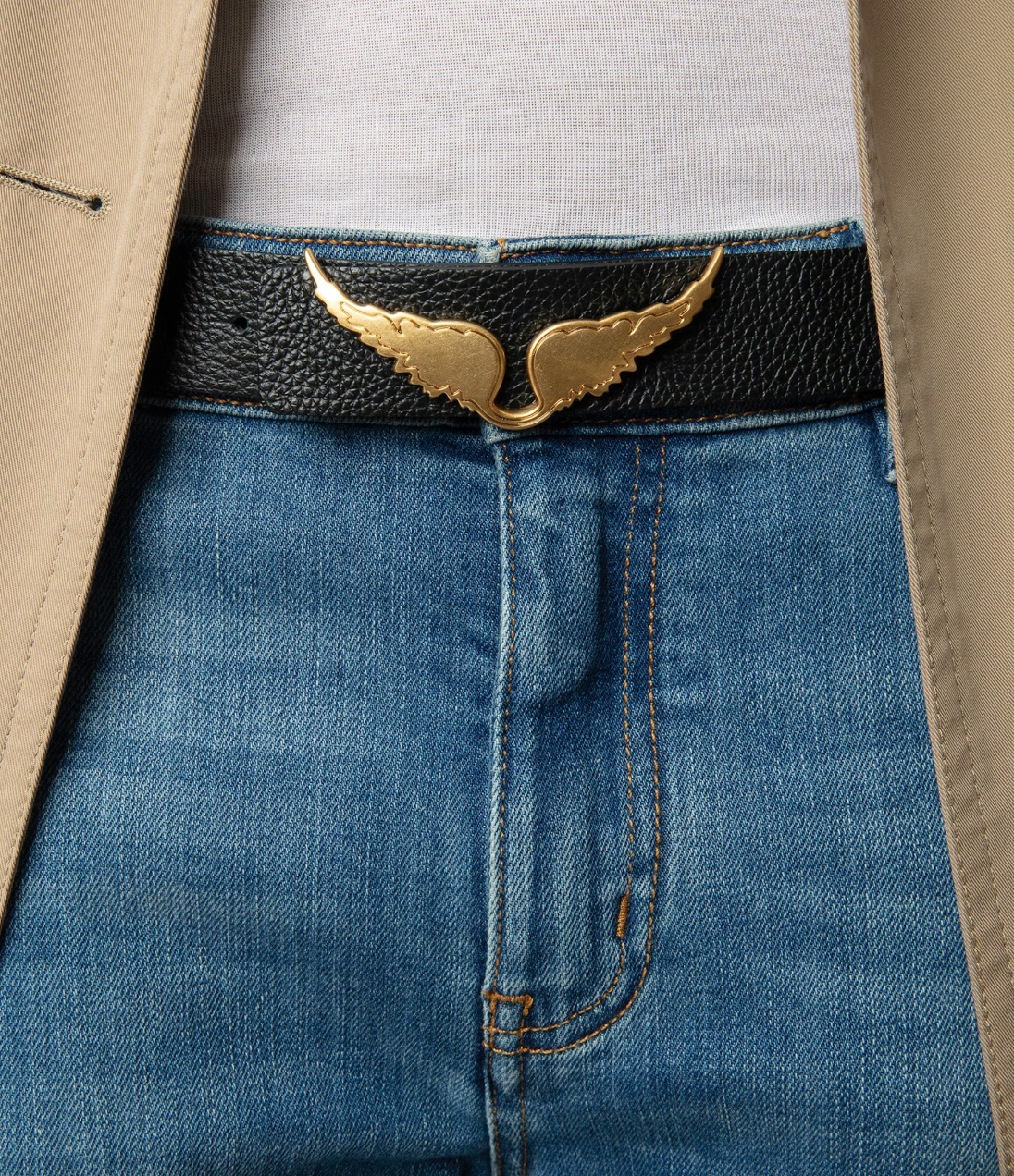 Reversible 30mm wide belt in grained leather with signature wings on the buckle.